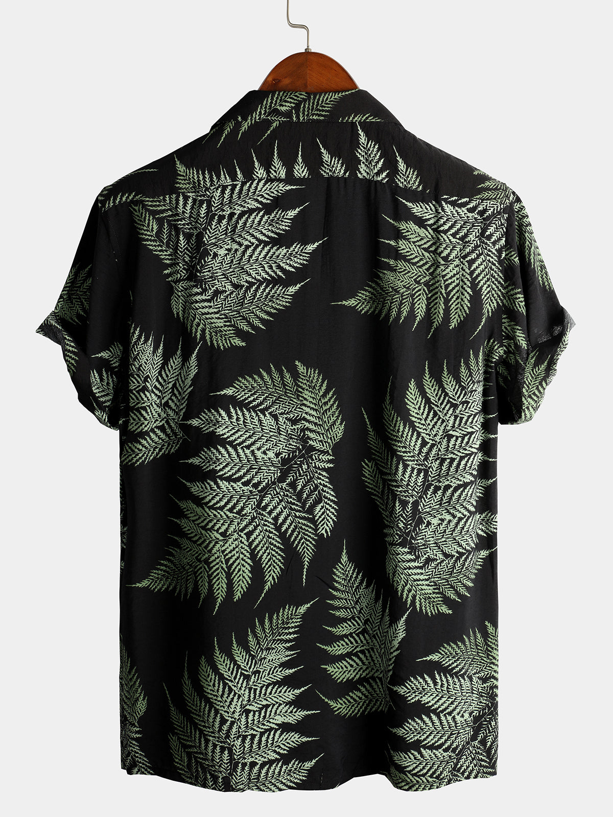 Men's Tropical Leaf Print Hawaiian Pocket Collared Top Cotton Button Up Short Sleeve Shirt