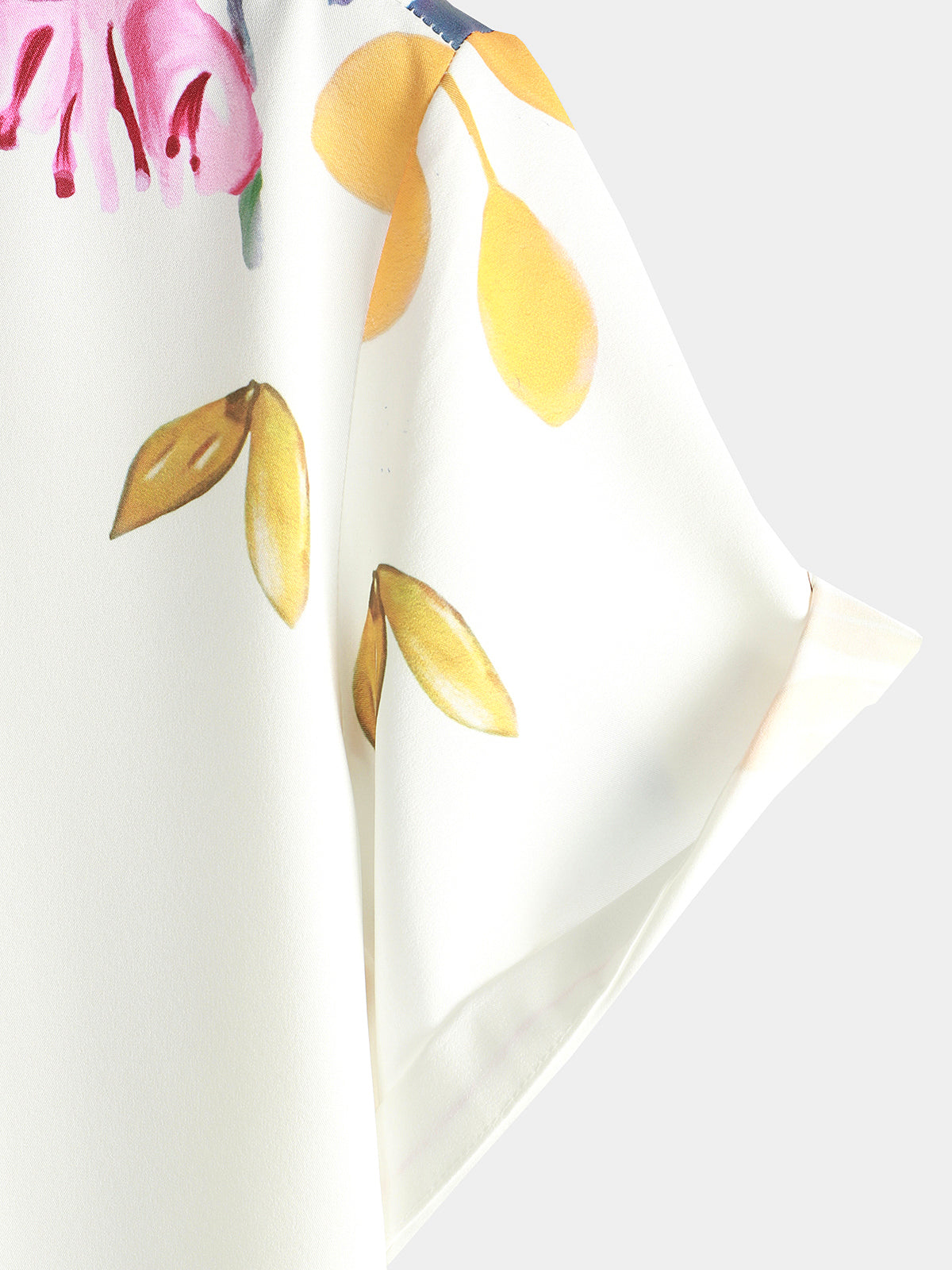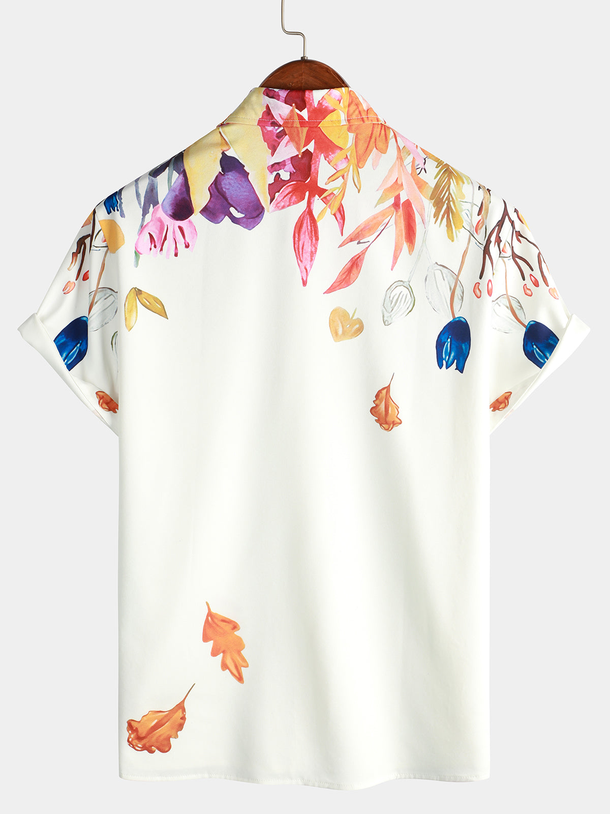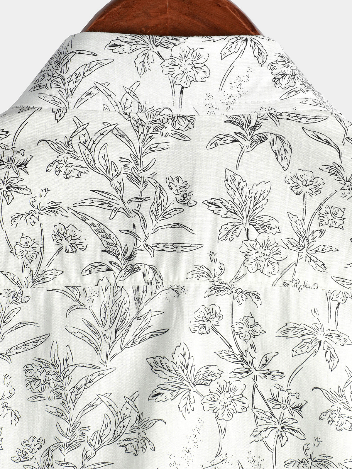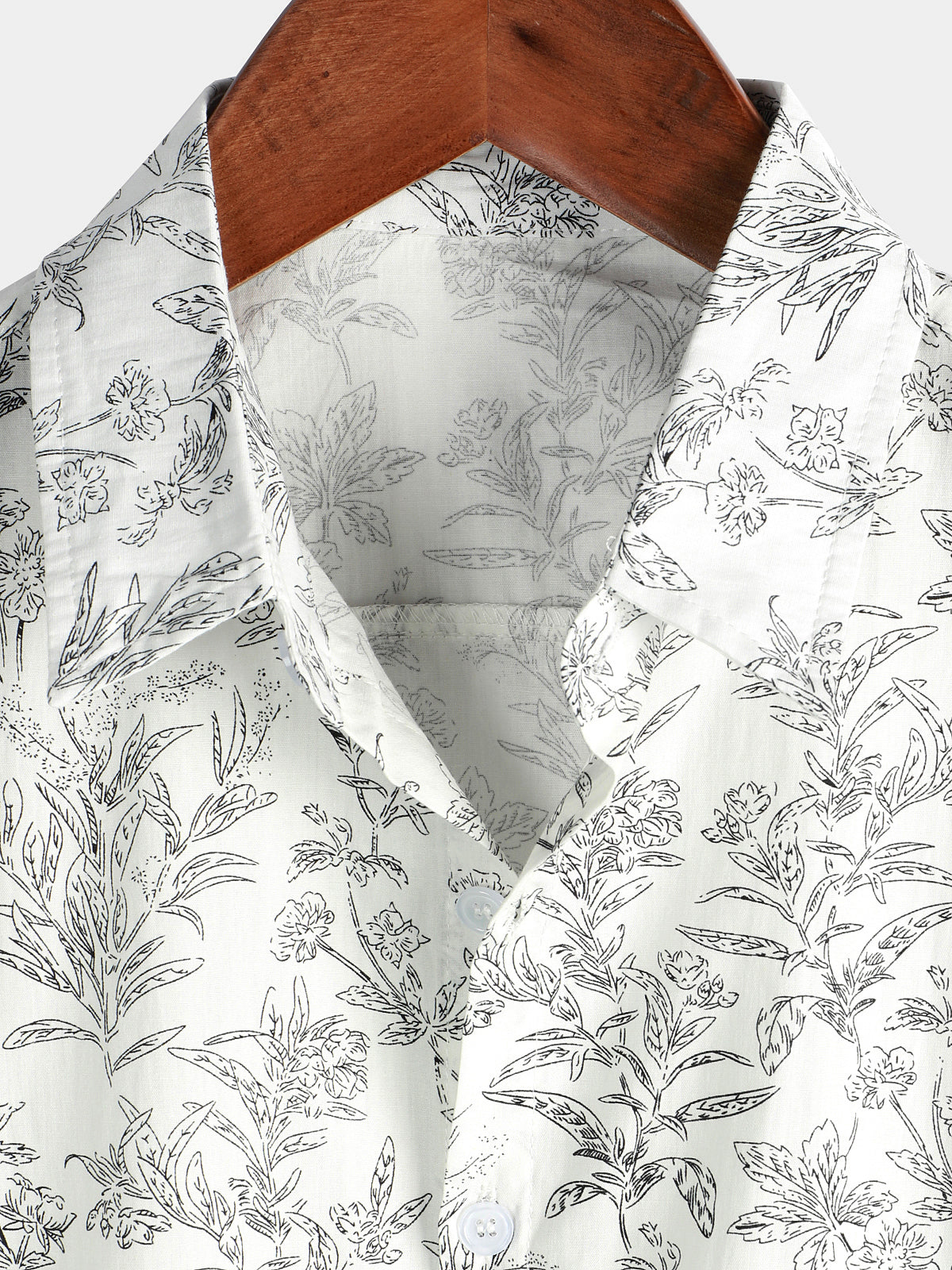 Men's Summer Floral Print Cotton Button Up Beach White Hawaiian Shirt