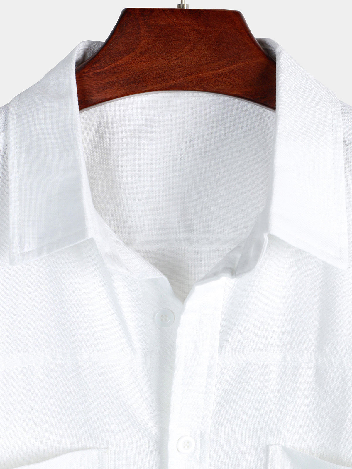 Men's Cotton & Linen Chest Pockets Solid Color Short Sleeve Shirt