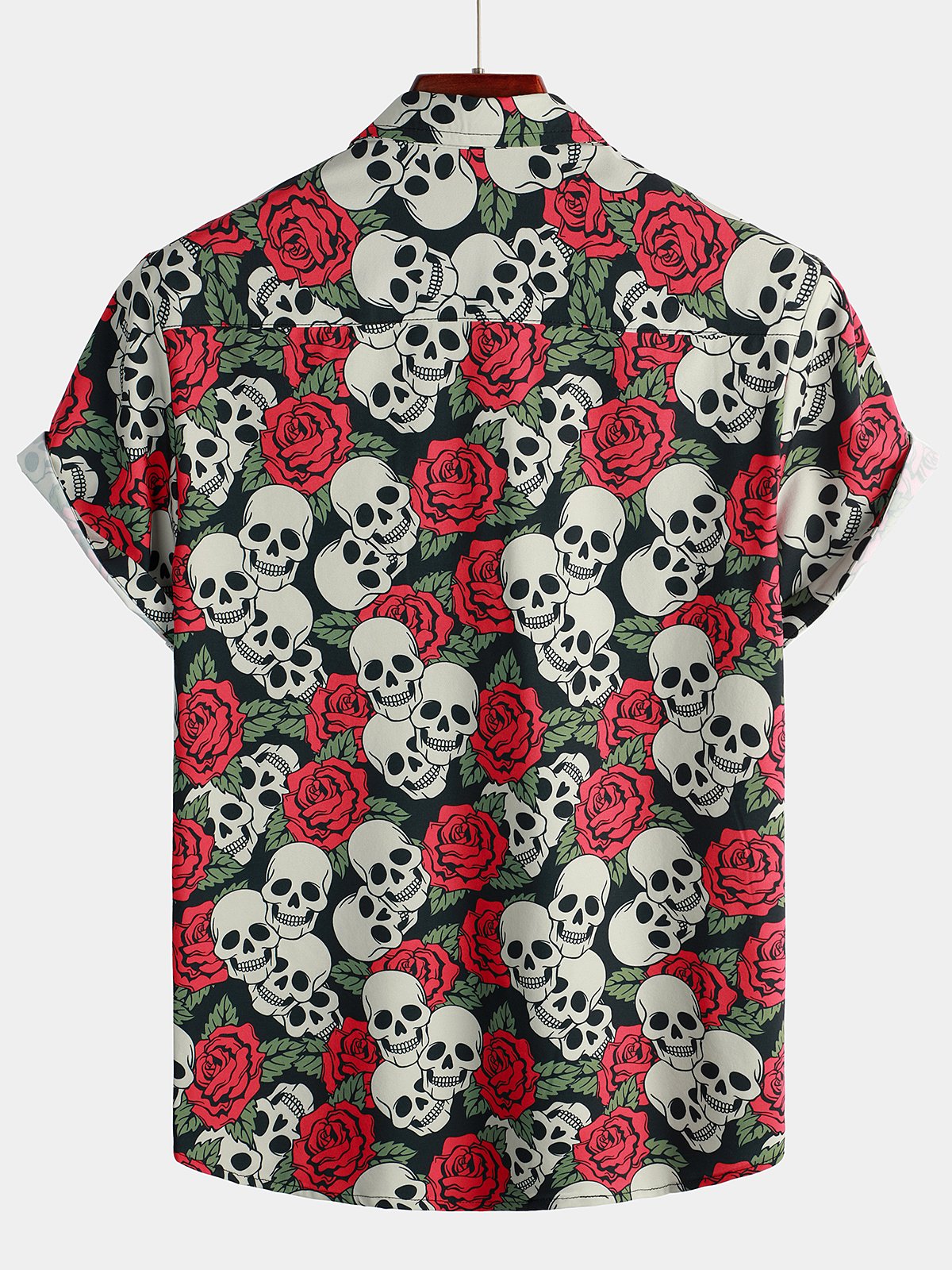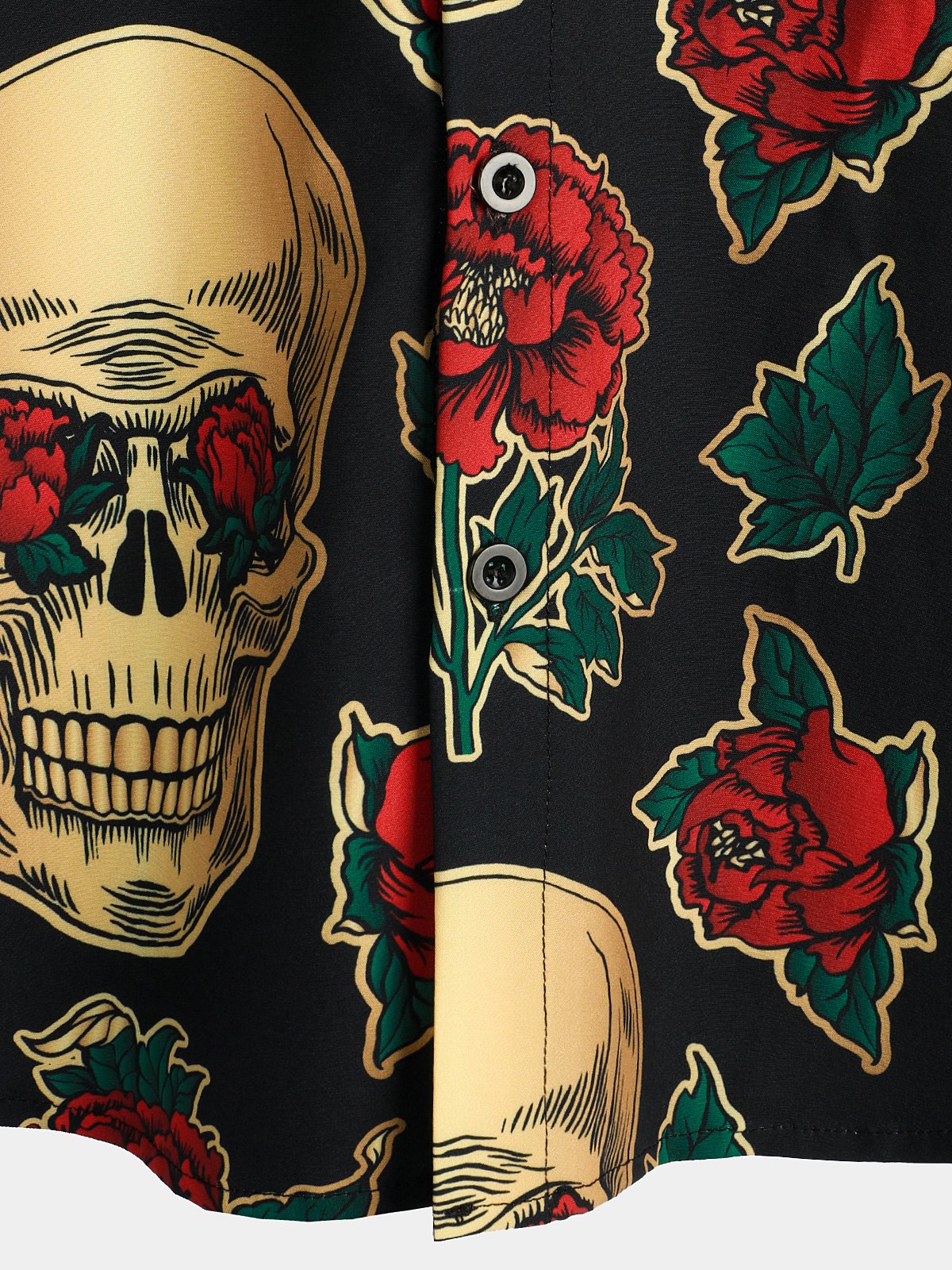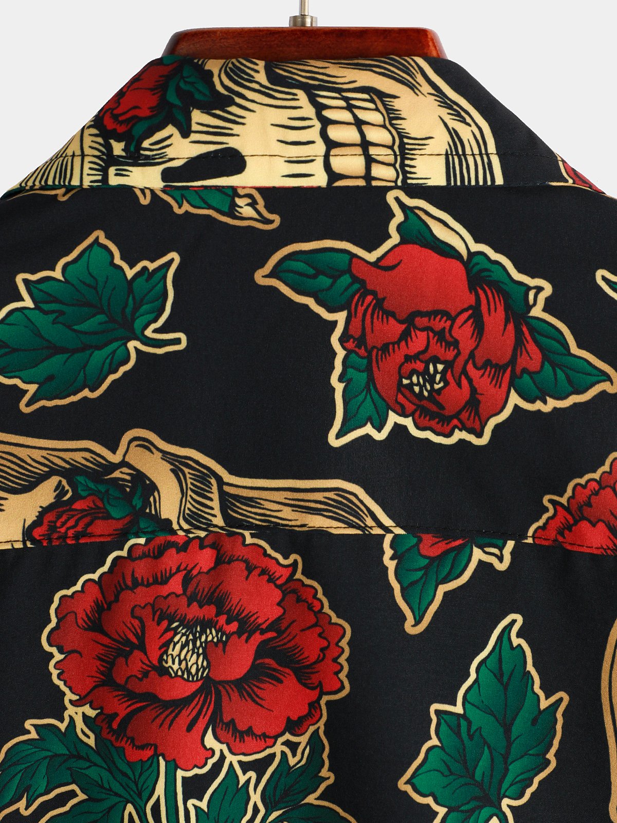 Men's Skull Floral Print Casual Lapel Button Short Sleeve Shirt