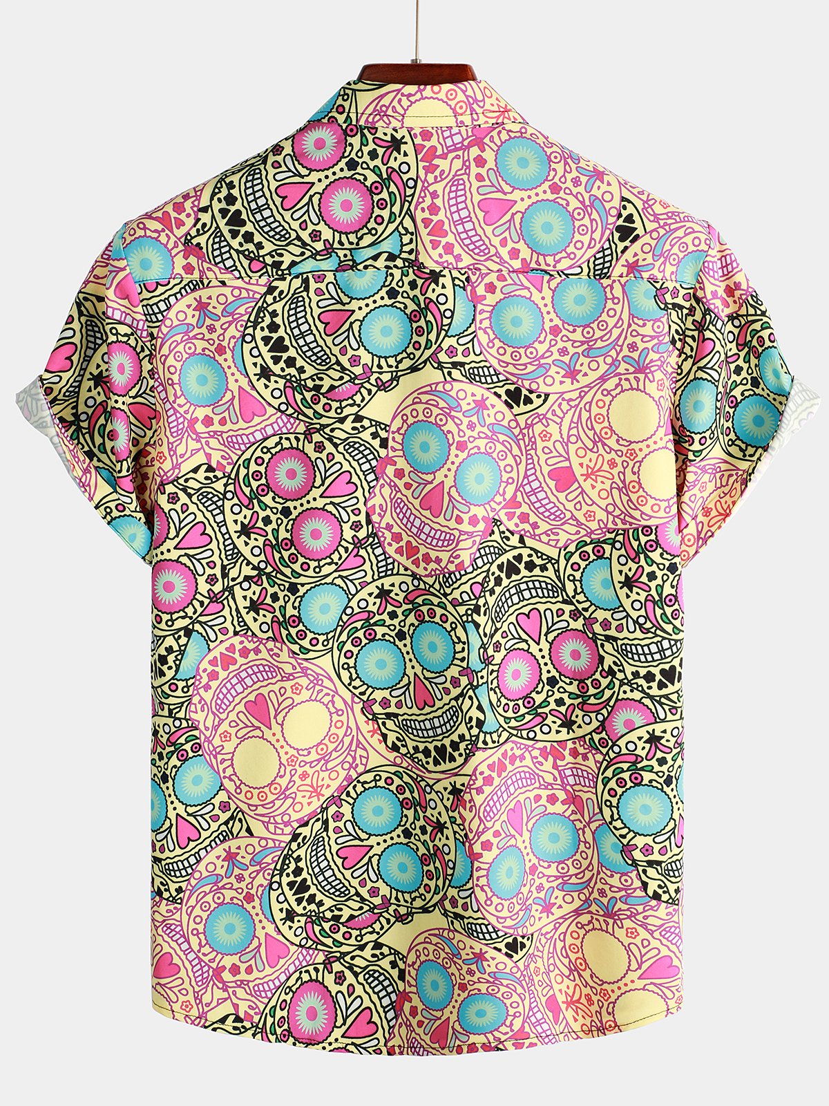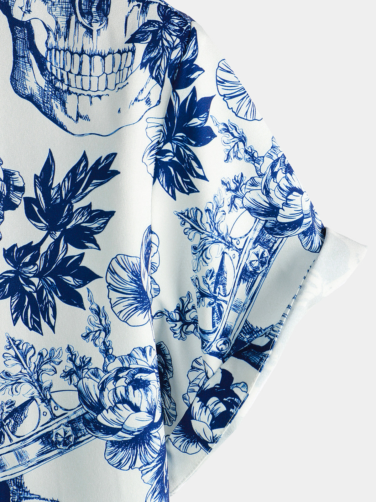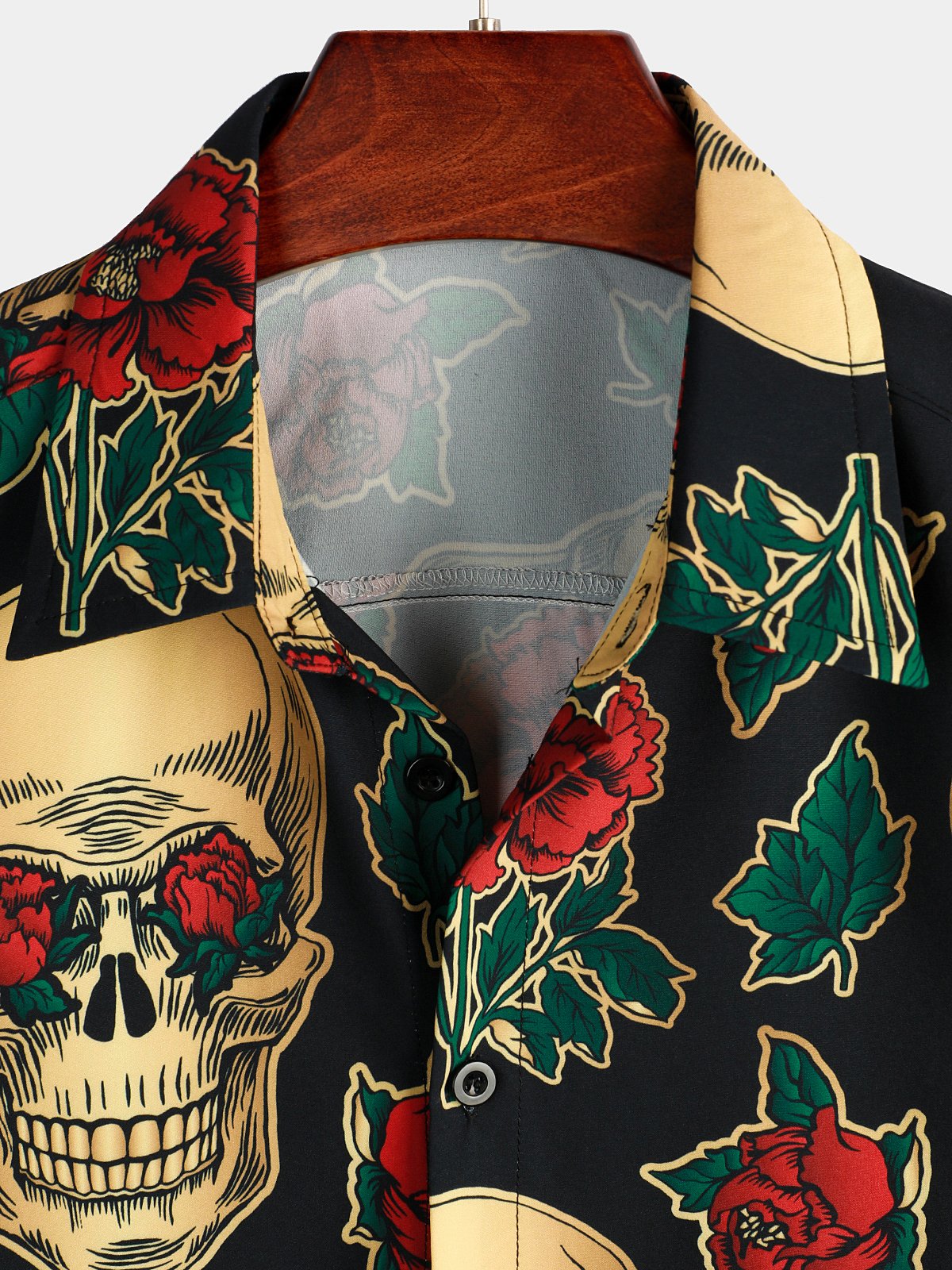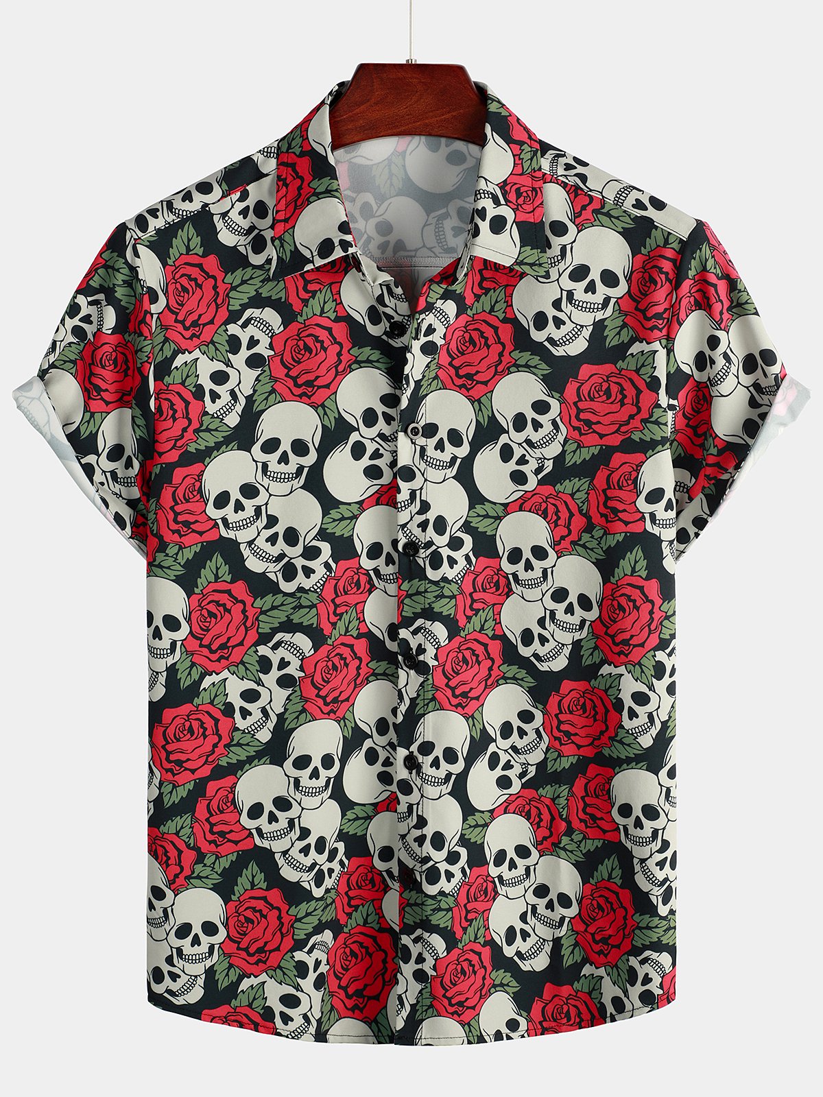 Men's Skull Floral Print Casual Lapel Button Short Sleeve Shirt