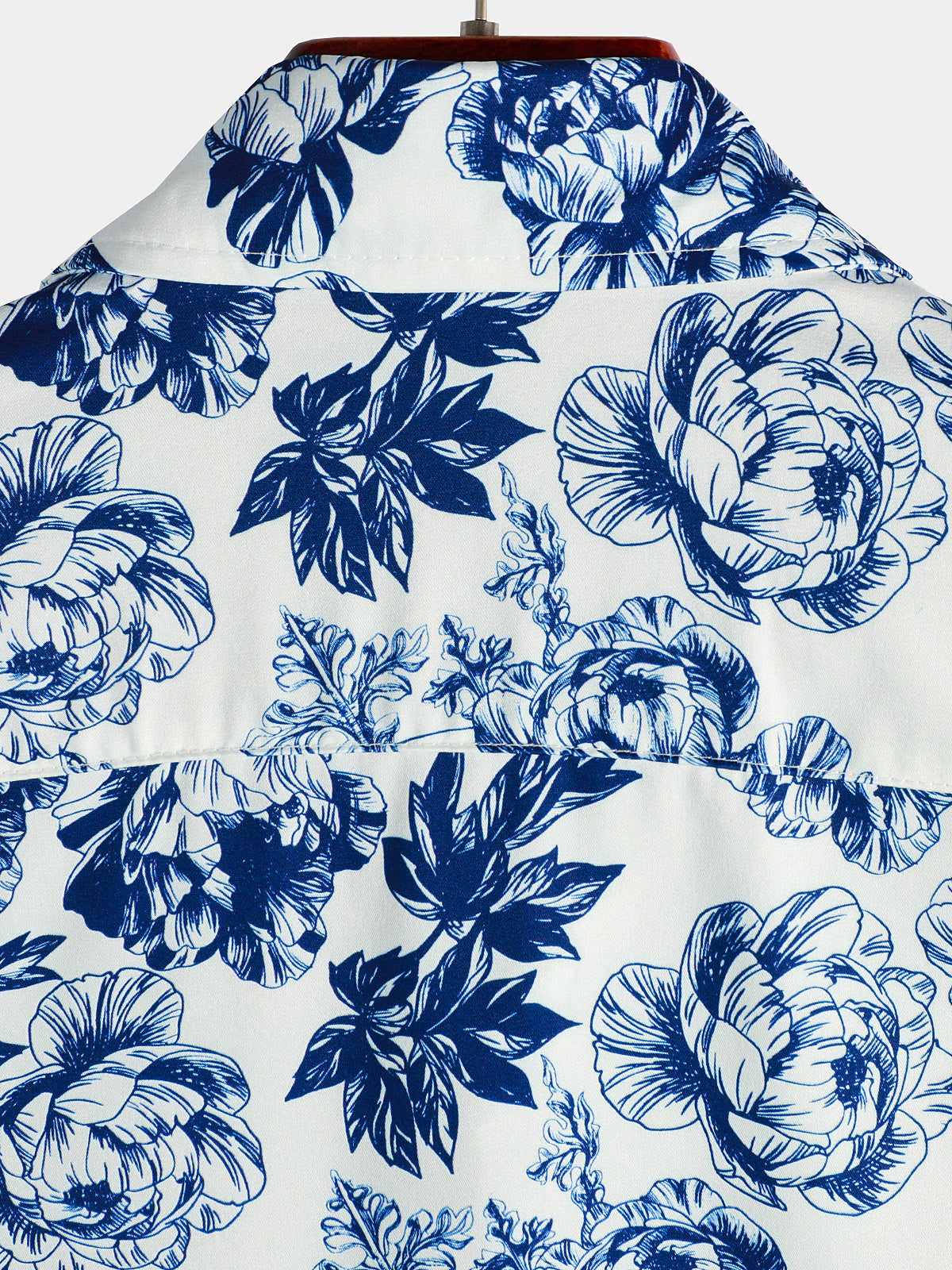 Men's Summer Casual Blue Floral Button Up Short Sleeve Holiday Cool Beach Shirt