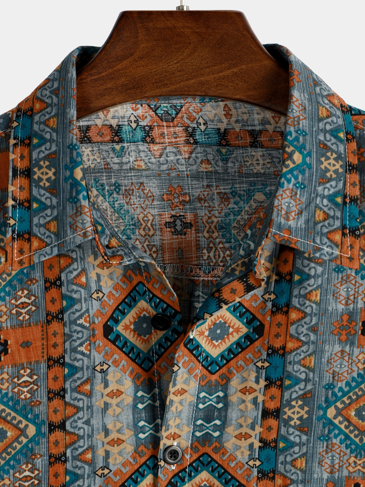 Men's Casual Vintage Short Sleeve 70s Retro Patchwork Button Up Lapel Cotton Aztec Print Shirt