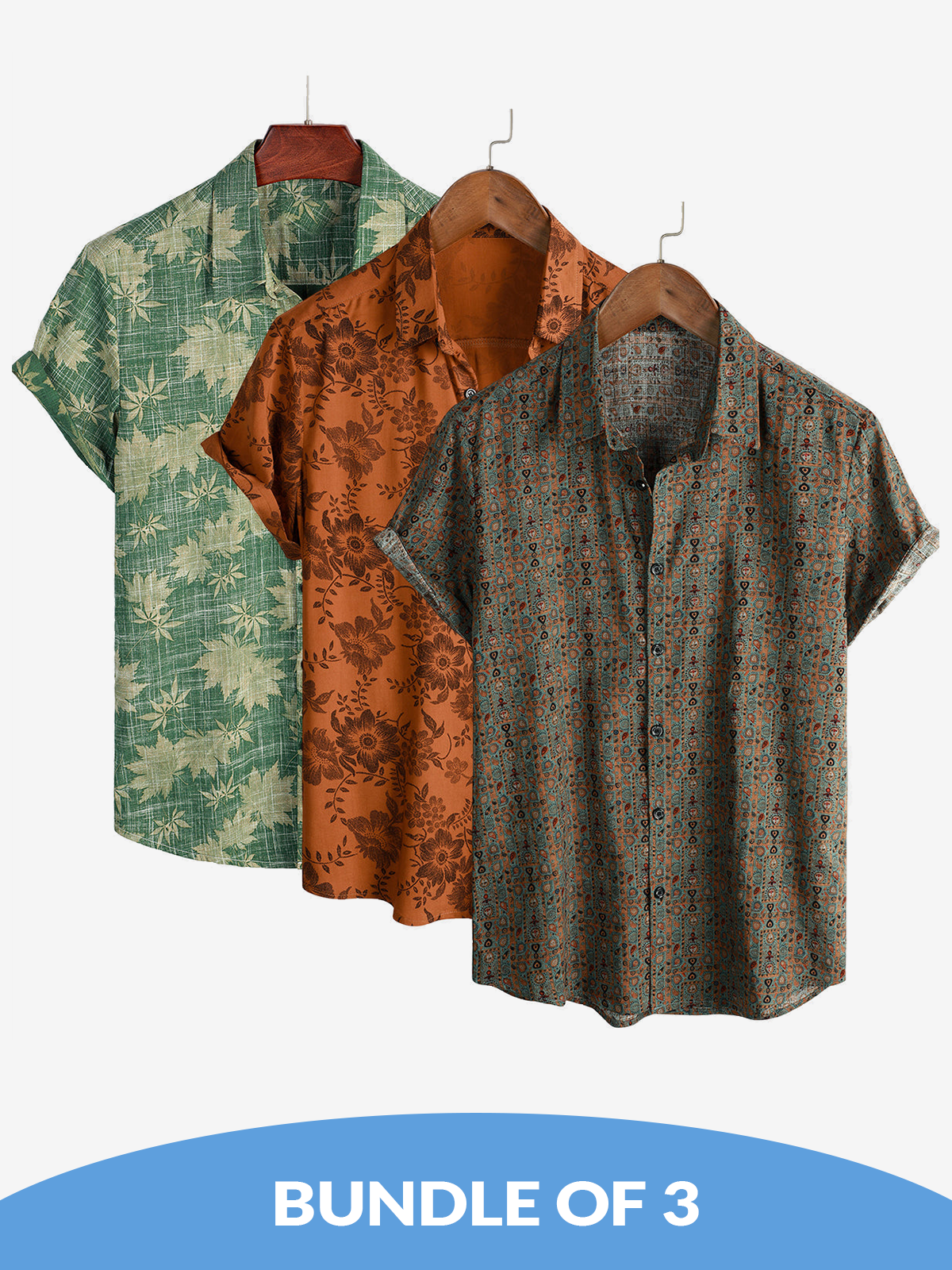 Bundle Of 3 |Men's Vintage Paisley Print 70s Green Boho Retro Tribal Short Sleeve Shirts