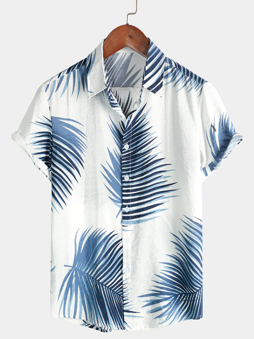 Men's Blue Cotton Vintage Floral Leaf Print Beach Hawaiian Short Sleeve Button Up Shirt