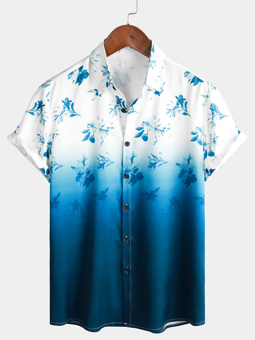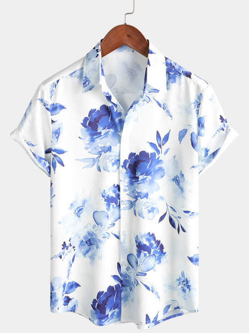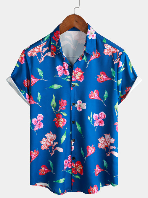 Men's Blue Floral Print Hawaiian Short Sleeve Shirt