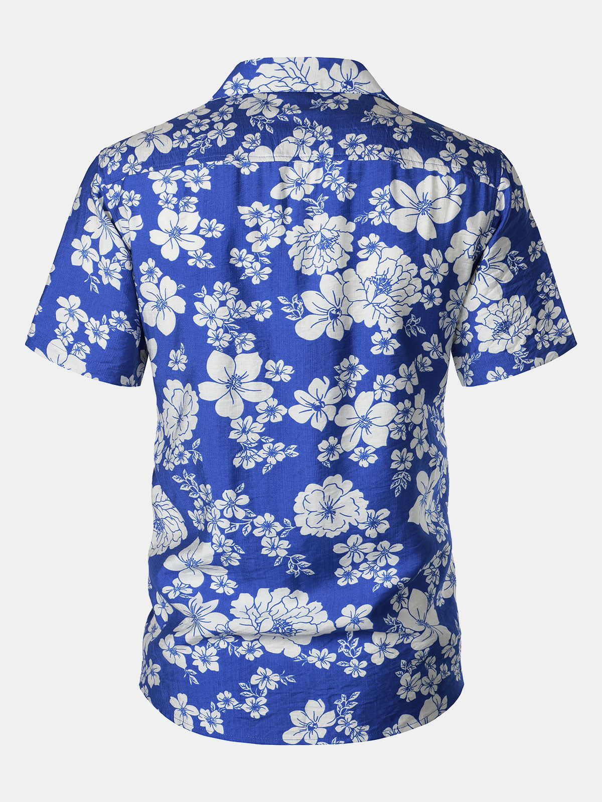 Men's Blue Floral Print Hawaiian Button Up Summer Beach Casual Collar Short Sleeve Shirt