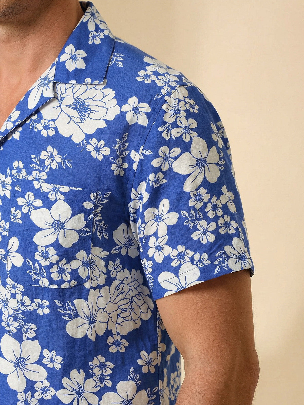Men's Blue Floral Pocket Hawaiian Cuban Collar Short Sleeve Shirt